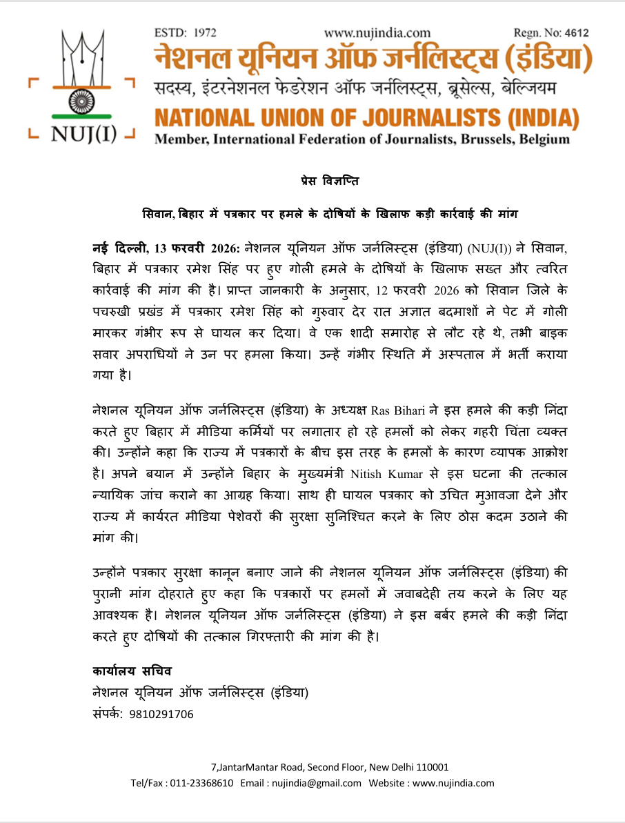 नई दिलà¥à¤²à¥€ जà¥à¤²à¤¾à¤ˆ 24, 2020 पतà¥à¤°à¤•ारों की हतà¥à¤¯à¤¾ और उतà¥à¤ªà¥€à¥œà¤¨ के खिलाफ à¤à¤¨à¤¯à¥‚जे का पà¥à¤°à¤§à¤¾à¤¨à¤®à¤‚तà¥à¤°à¥€ कारà¥à¤¯à¤¾à¤²à¤¯ तक वि