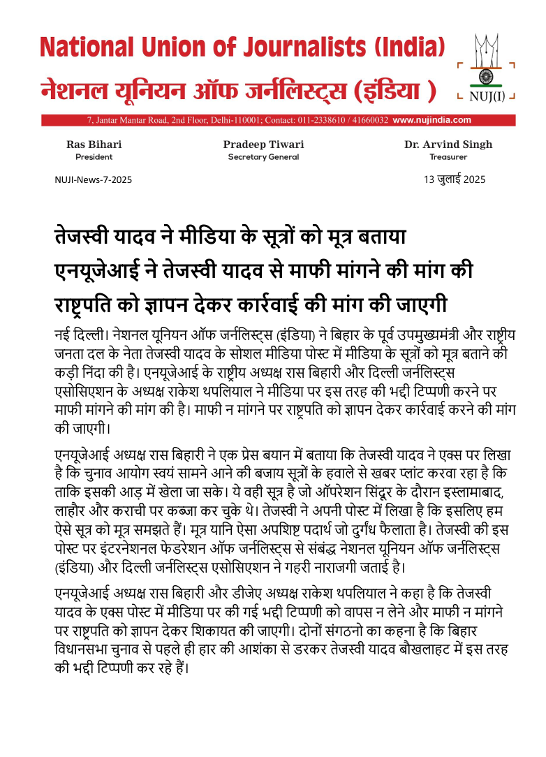 नई दिलà¥à¤²à¥€ जà¥à¤²à¤¾à¤ˆ 24, 2020 पतà¥à¤°à¤•ारों की हतà¥à¤¯à¤¾ और उतà¥à¤ªà¥€à¥œà¤¨ के खिलाफ à¤à¤¨à¤¯à¥‚जे का पà¥à¤°à¤§à¤¾à¤¨à¤®à¤‚तà¥à¤°à¥€ कारà¥à¤¯à¤¾à¤²à¤¯ तक वि